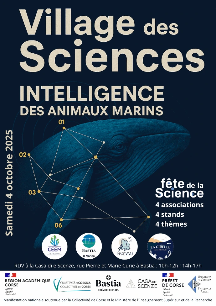 Retour en images sur la Fête de la Science 2025 à Bastia, à laquelle le CEEM a participé aux côtés des associations Mare Vivu, La Girelle et U Marinu. Accueilli à la Casa di e Scenze, cet événement a réuni le public autour d’un thème commun : l’intelligence des animaux marins. Le CEEM a proposé un stand dédié aux cétacés, invitant petits et grands à découvrir le rôle essentiel du son chez ces animaux fascinants. Parcours interactif « Écoute comme un dauphin », ateliers sonores, quiz et échanges ont permis de sensibiliser de manière ludique aux enjeux de la pollution sonore en mer. Une belle journée de partage, de découvertes et de rencontres autour du monde marin.